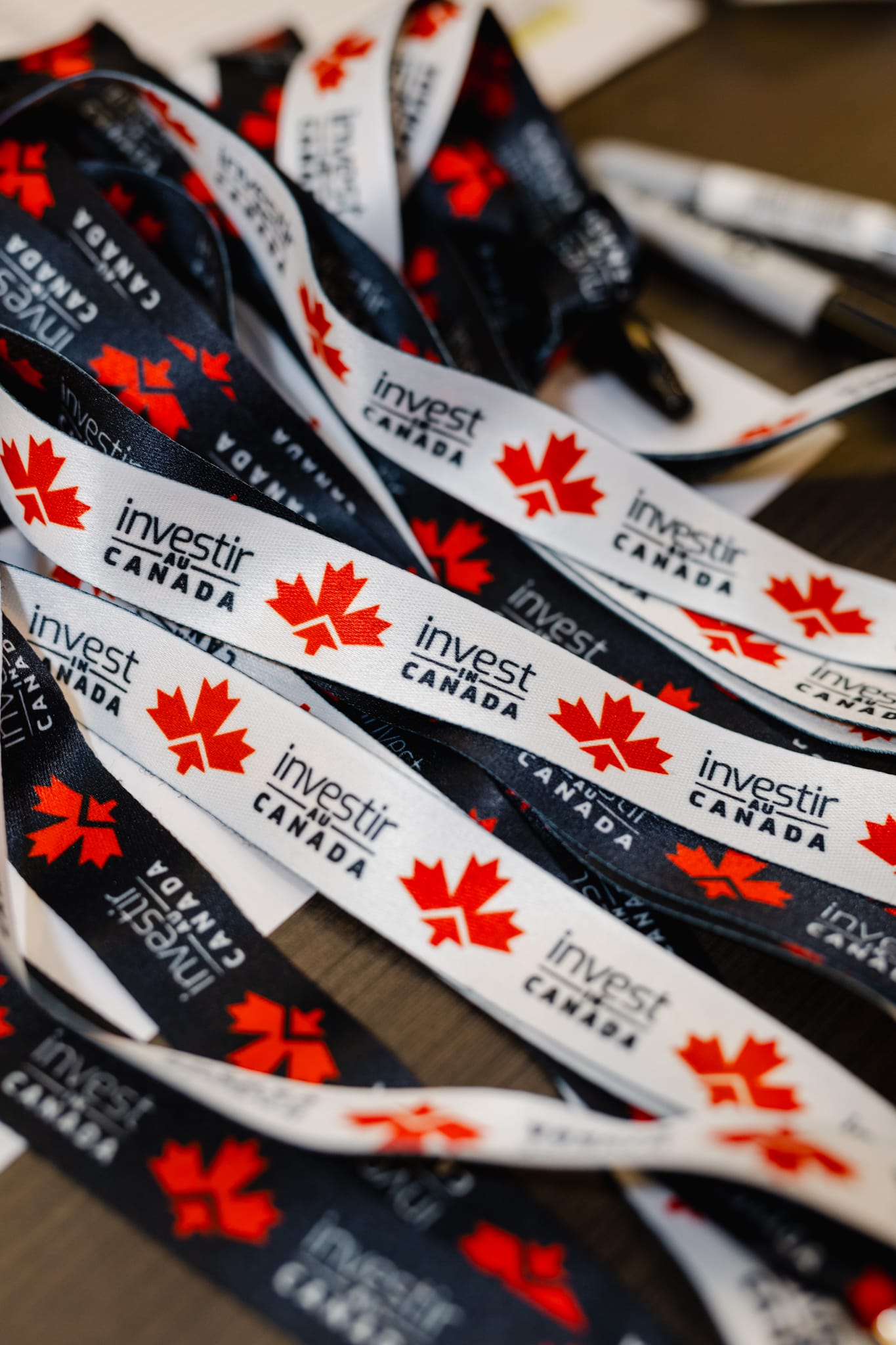 A pile of invest in Canada lanyards with maple leaf motifs, captured in event photography.